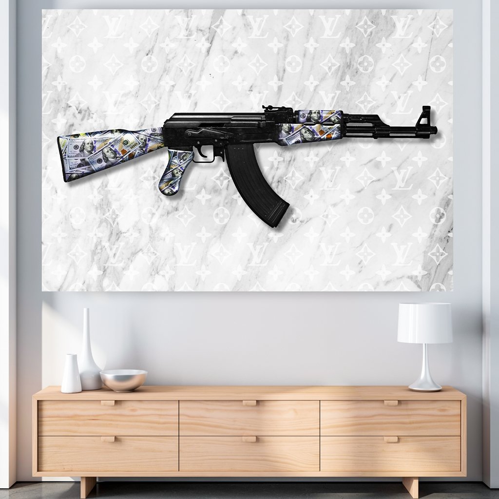 An AK, also known as the Kalashnikov, against the background of the logo of the world-famous luxury bag brand Louis Vuitton. With dollar bills, the black AK stands out against the white background.