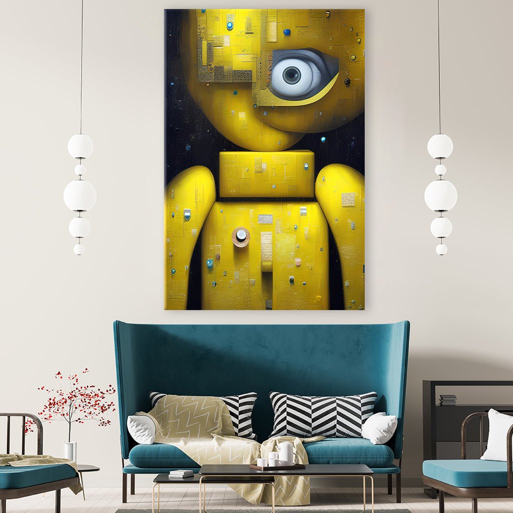 Immerse yourself in the world of abstract art with this captivating motif. A yellow figure rises from a composition of various geometric shapes that merge together to form a fascinating structure. A single eye that skillfully emphasizes the figure captures the viewer's gaze. This abstract motif with the yellow figure on a dark background is an eye-catcher in every room.