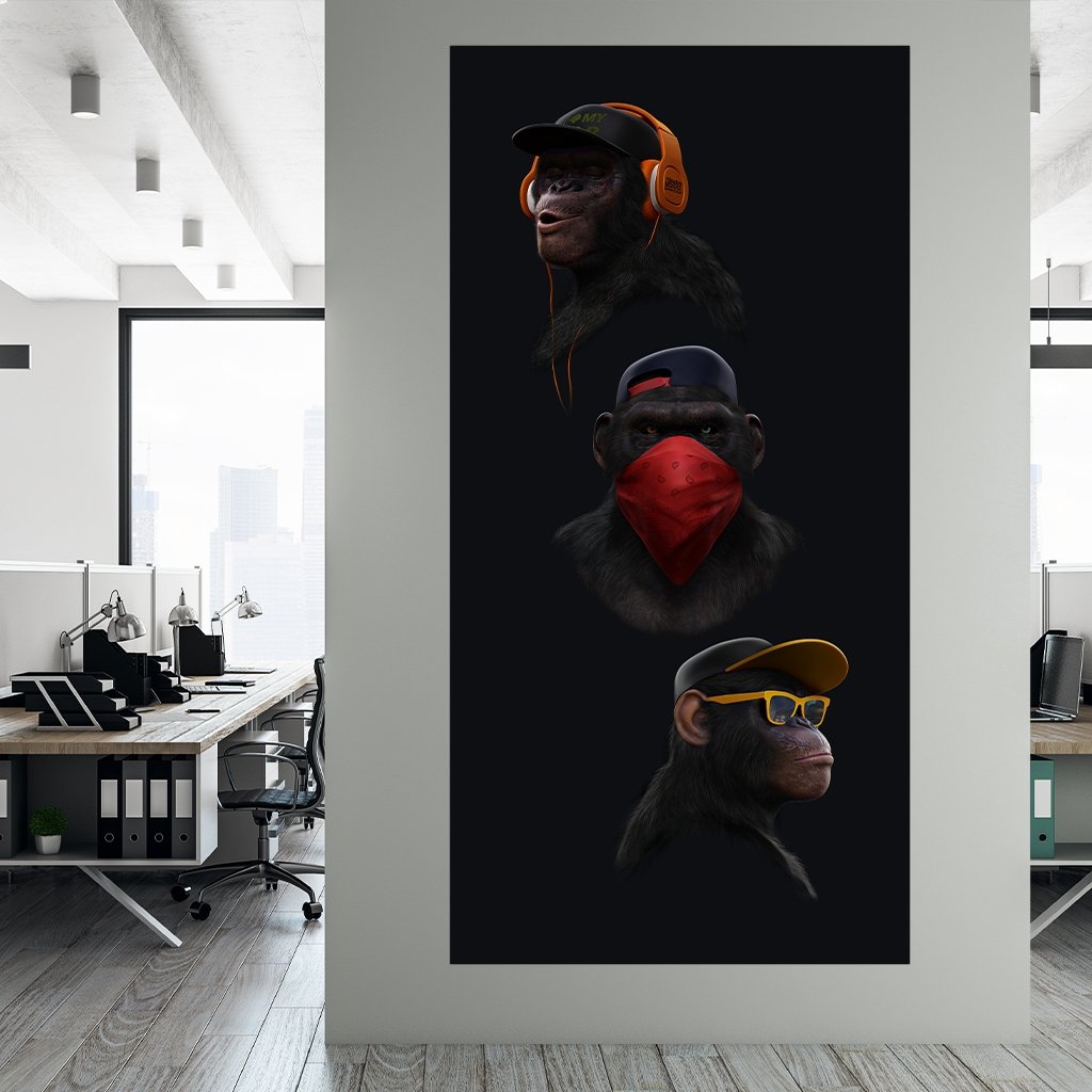 The history of the motif with the 3 monkeys originally comes from Japan and means “see nothing, hear nothing, say nothing”. At the top of the motif you will find a monkey "hear nothing" with a baseball cap and orange headphones. In the middle there is the monkey "say nothing" with a red scarf and the bottom monkey "see nothing" has yellow glasses and a baseball cap on. Perfect for your living room.