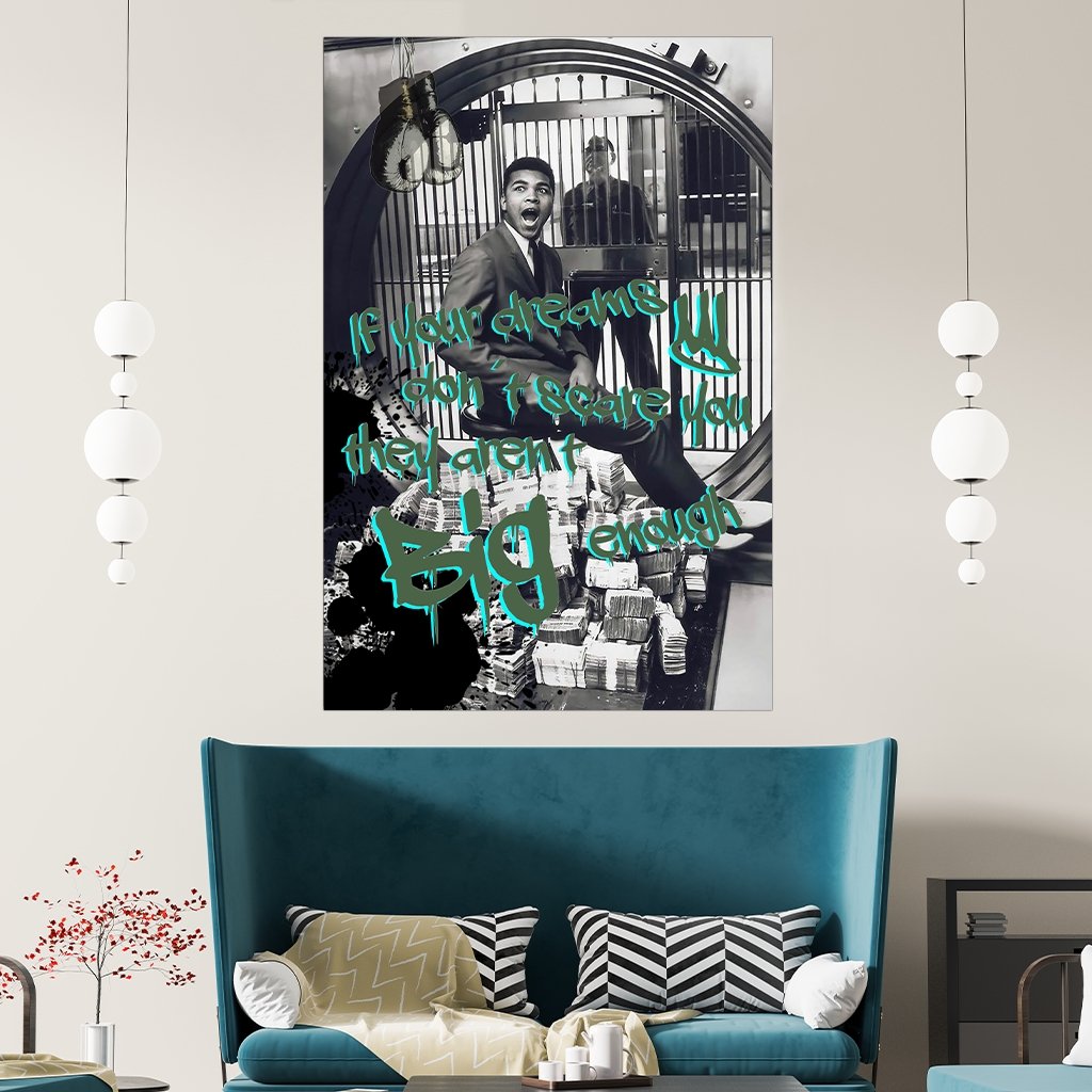 The motif shows a scene in black and white in which Ali sits in a bank vault full of money. With a joyful expression, he sits down on the banknotes and lets his eyes wander over the banknotes. In the front part of the motif there is the text: "If your dreams don't scare you, they aren't big enough." The text adds an inspirational and motivating touch to the subject, encouraging the viewer to dream boldly and pursue big goals.