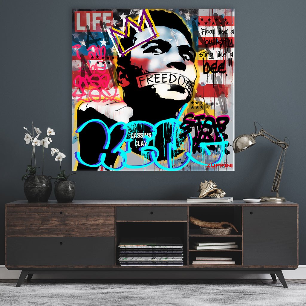 A stencil-style portrait of Muhammad Ali, sporting a distinctive crown and a "FREEDOM" tape over his mouth, against a backdrop of a stylized American flag. Vibrant graffiti elements, such as "Float like a butterfly, sting like a bee" and "Cassius Clay," frame the composition. The work blends pop art and street art aesthetics to honor Ali's iconic legacy and his fight for freedom.