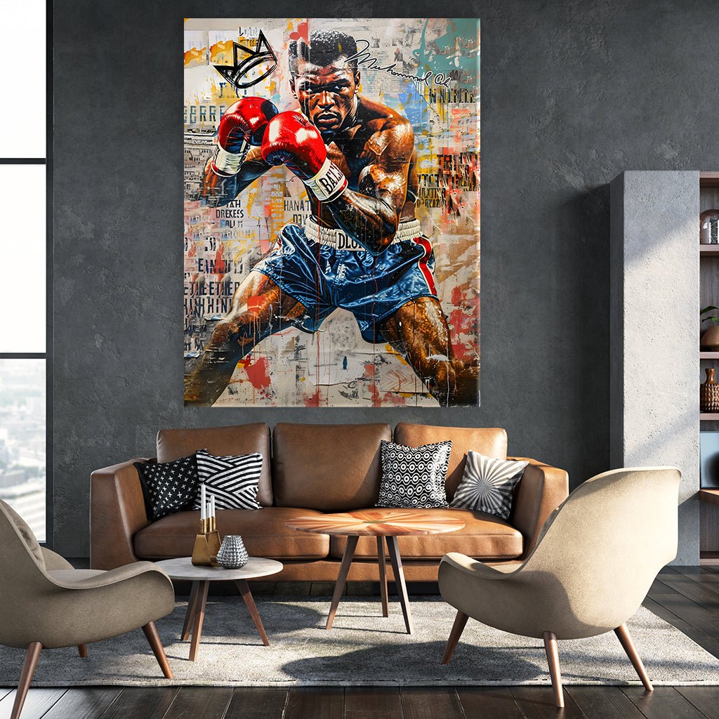 The motif shows an impressive street art portrait of Muhammad Ali, the legendary boxer. Ali is depicted in a combative pose, with raised fists and an intense gaze directed directly at the viewer. He is wearing red boxing gloves and blue shorts, which immediately catch the eye due to the strong colors.