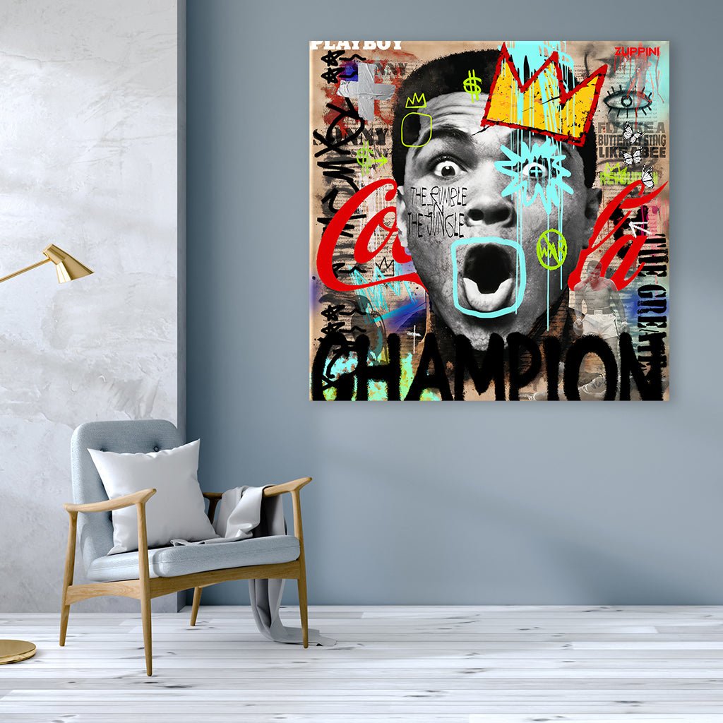 The image depicts a dynamic, black-and-white portrait of Muhammad Ali with his mouth and eyes wide open, crowned by an expressive yellow crown with turquoise accents. Surrounding Ali are numerous graffiti elements, brand logos such as "Coca-Cola" and "Playboy," as well as quotes such as "THE RUMBLE IN THE JUNGLE" and "FLOAT LIKE A BUTTERFLY STING LIKE A BEE." Combining pop art and street art aesthetics, the work captures Ali's iconic presence and fighting spirit.