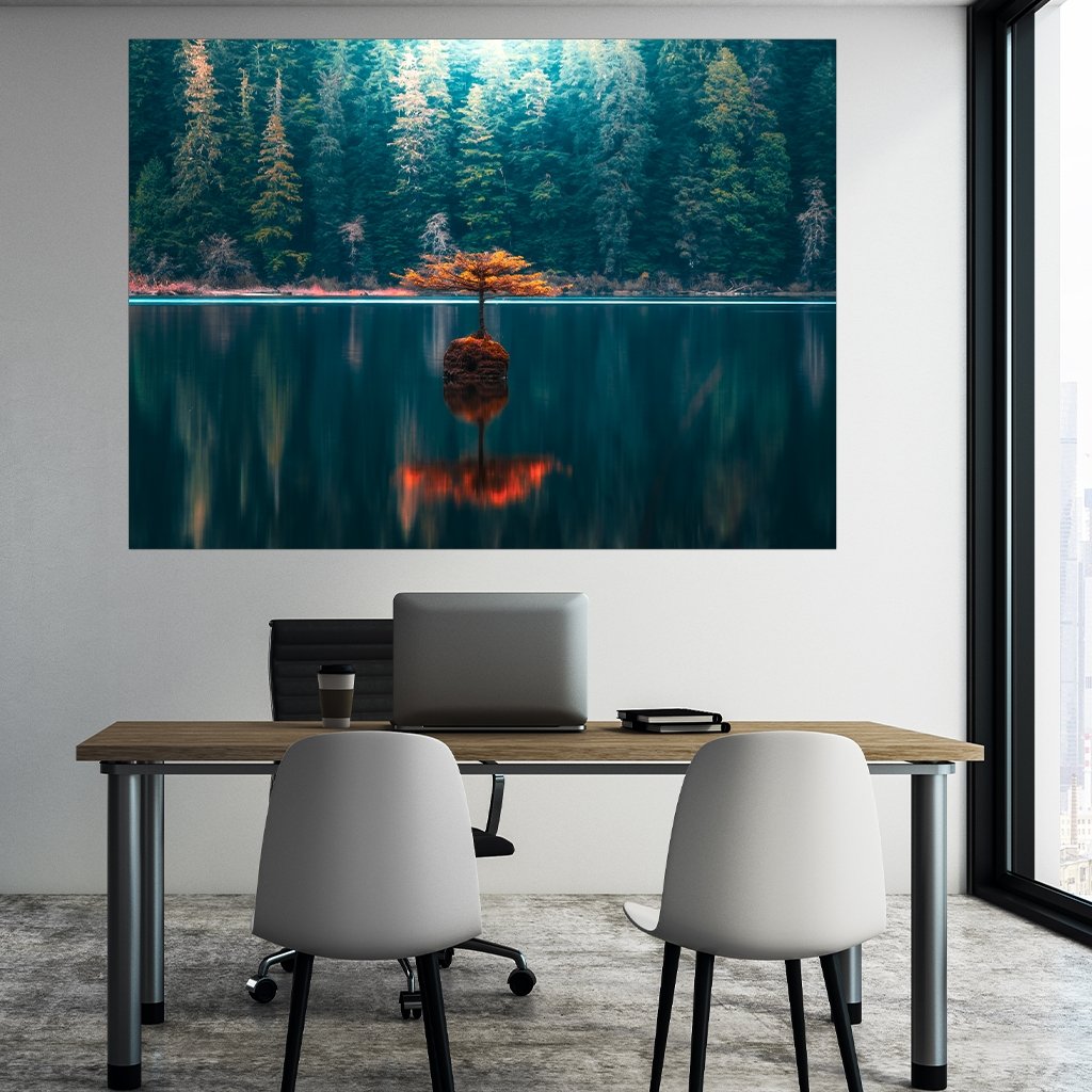 Alone. Solitary. A solitary tree in autumn in the middle of a lake, its leaves turning red. Silence surrounds it. Alone, yet surrounded by other trees. Everyone knows this feeling. This motif depicts contentment and tranquility. Enjoy this image and take a deep breath in your living room, bedroom, or even hallway, and savor the moment of peace.