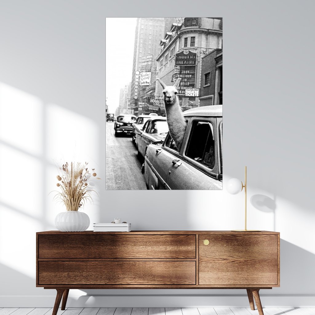 You can't believe your eyes... An alpaca looks out the window of a car in the middle of the city. A great snapshot and a must for your walls.