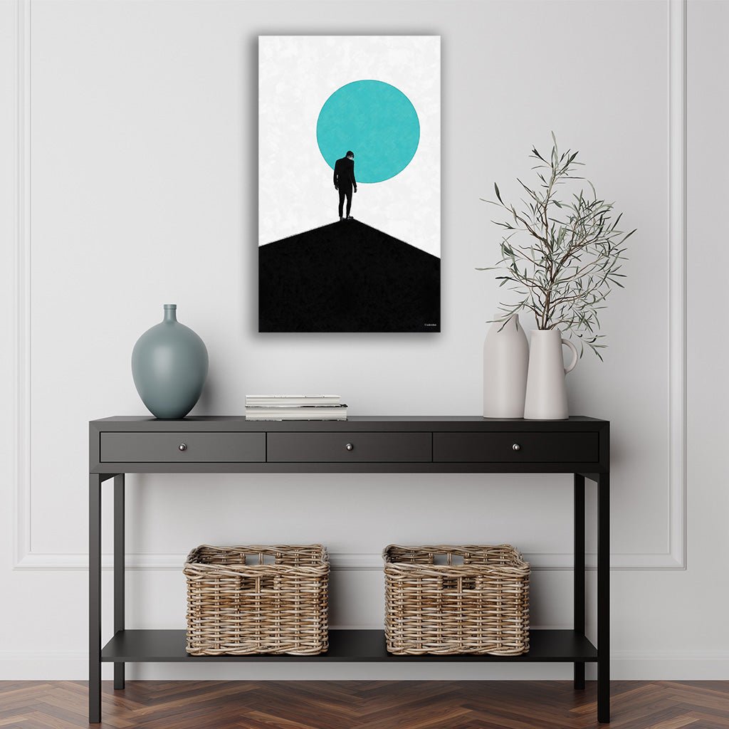 This portrait-format, modern-style motif is the work of Greek artist Mr. Underdott. His works are a blend of minimalism and surrealism. He creates environments with geometric shapes and elements from history to the modern era.