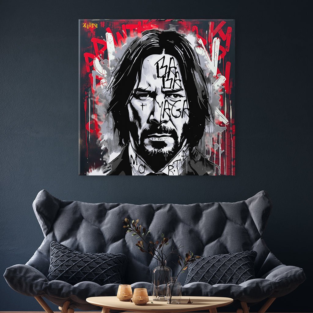 Stylized portrait of Keanu Reeves as John Wick. His face is covered in striking graffiti lettering such as "Baba Yaga," alluding to the character. The background is a mix of gray and red tones with white and red graffiti elements, creating a chaotic and intense impression.