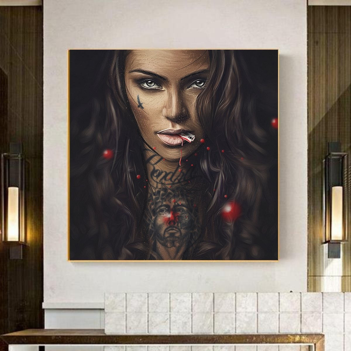 Our brown-haired tattooed beauty is not to be trifled with. With a razor blade in her mouth and blood splatters all around her, she's probably best to be wary of.
