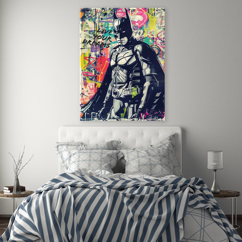 The motif shows Batman in one of his typical poses and with a grim look. He is designed in black and white. The background is a colorful graffiti work of art with various fonts and image elements and the motivational slogan "live your dreams". The colorful background makes the simply colored Batman stand out even more and gives the image a dynamic and lively atmosphere.