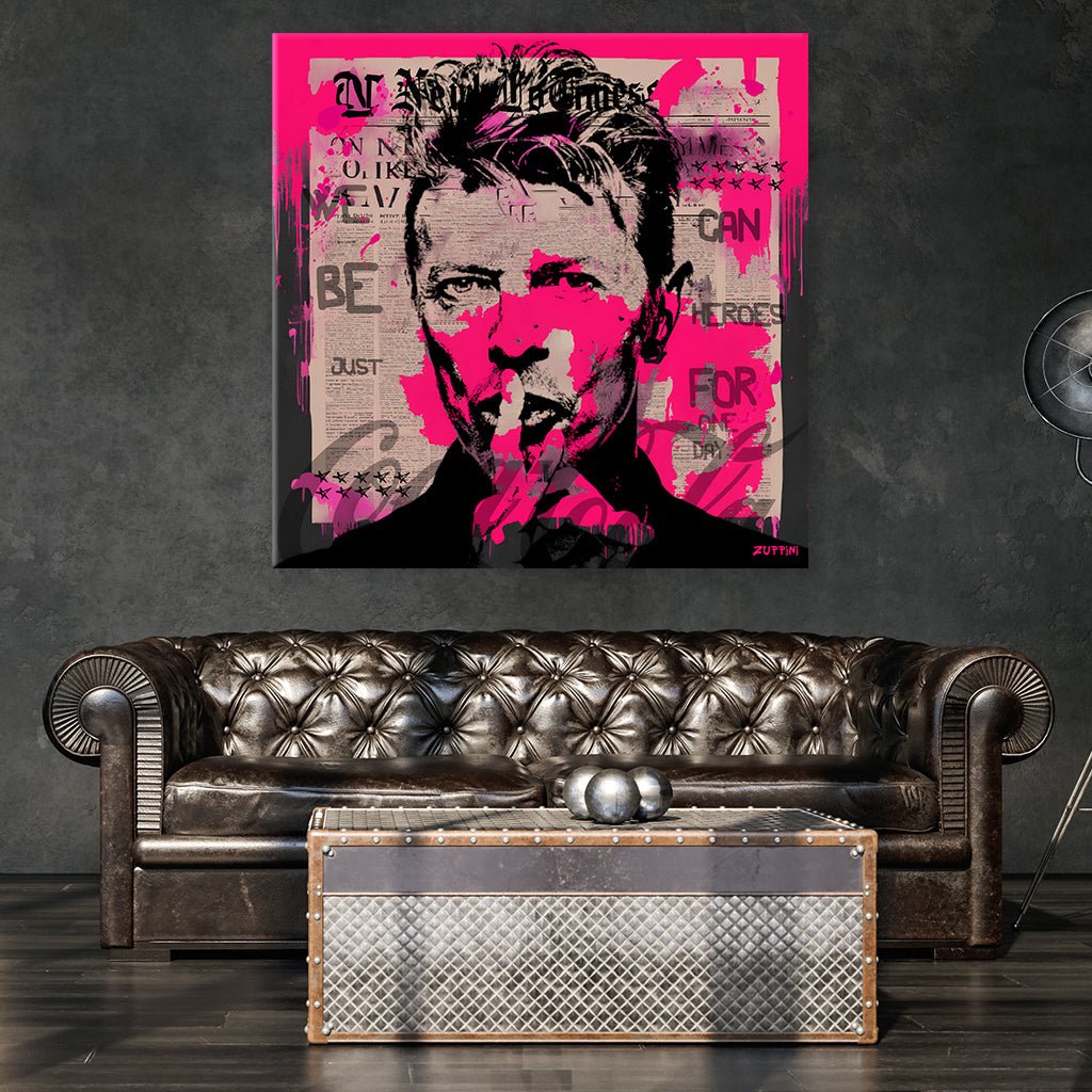 The image shows a striking black-and-white portrait of David Bowie placing a finger over his mouth. The portrait is heavily overlaid with bright pink paint splatters and graffiti elements, which also cover his eyes and lips. The background consists of newspaper articles, some of which read "The New York Times" and "WE CAN BE HEROES FOR ONE DAY."