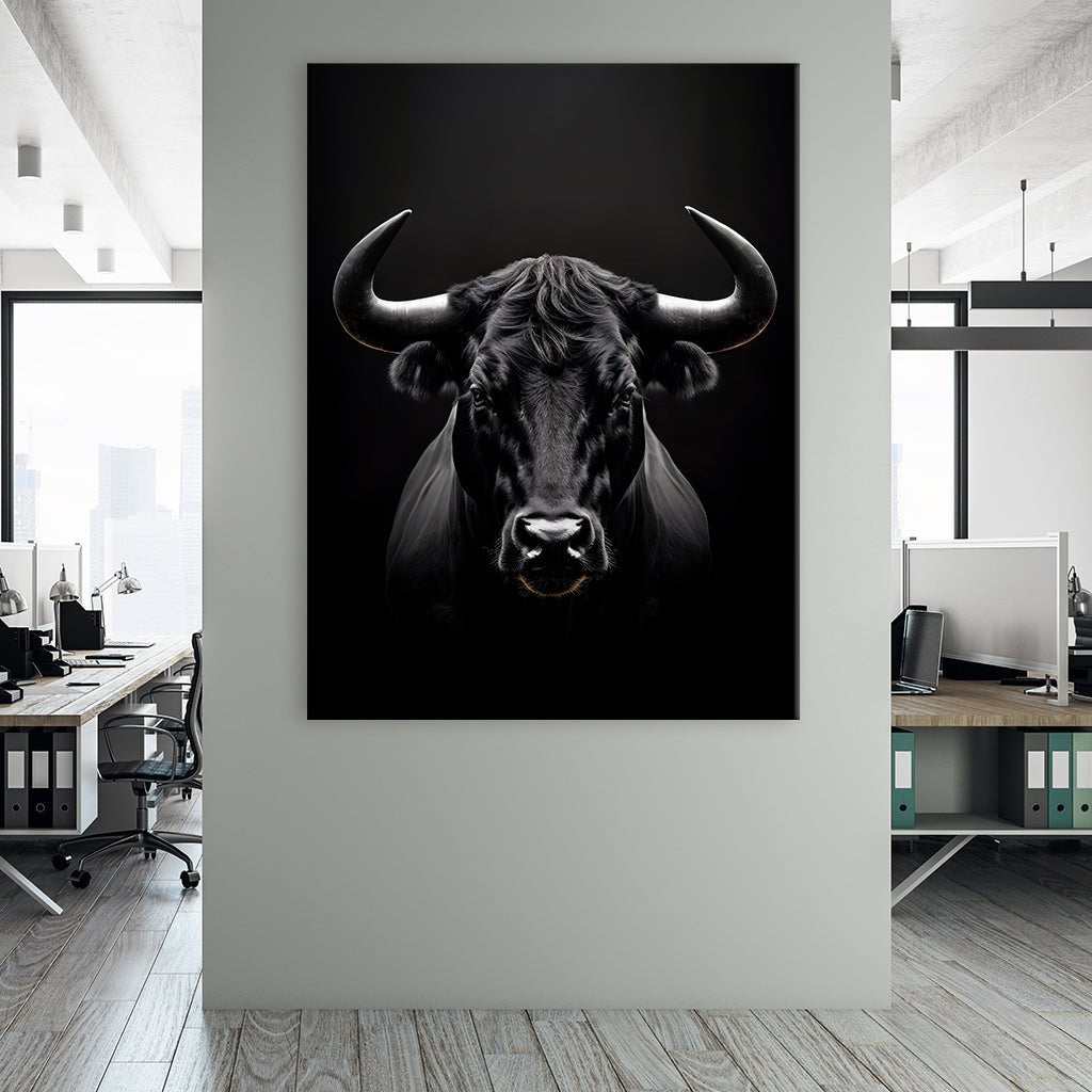An impressive bull sits enthroned in the center of this picture. In black and white, on a deep black background, the close-up shows his imposing presence. His majestic horns and proud look directly into the camera convey strength and majesty.
