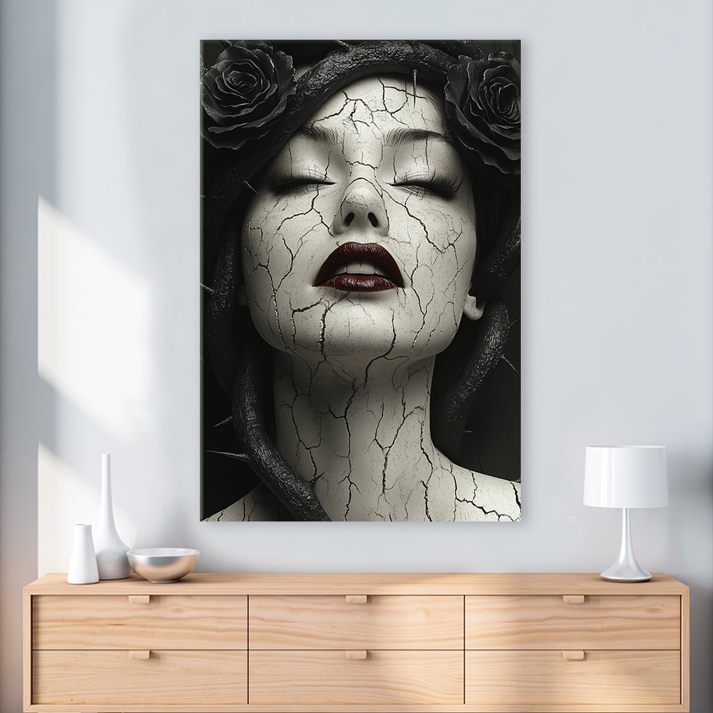 The entire image is done in a monochrome color scheme, ranging from light, broken skin tones to deep blacks, giving the motif a dark and mysterious atmosphere.
