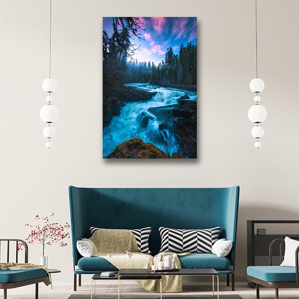 Experience the impressive beauty of nature with this fascinating photography. The picture shows a river with a rapid current flowing through a picturesque forest. The vibrant colors and breathtaking lighting create a unique atmosphere and immerse the viewer in nature.