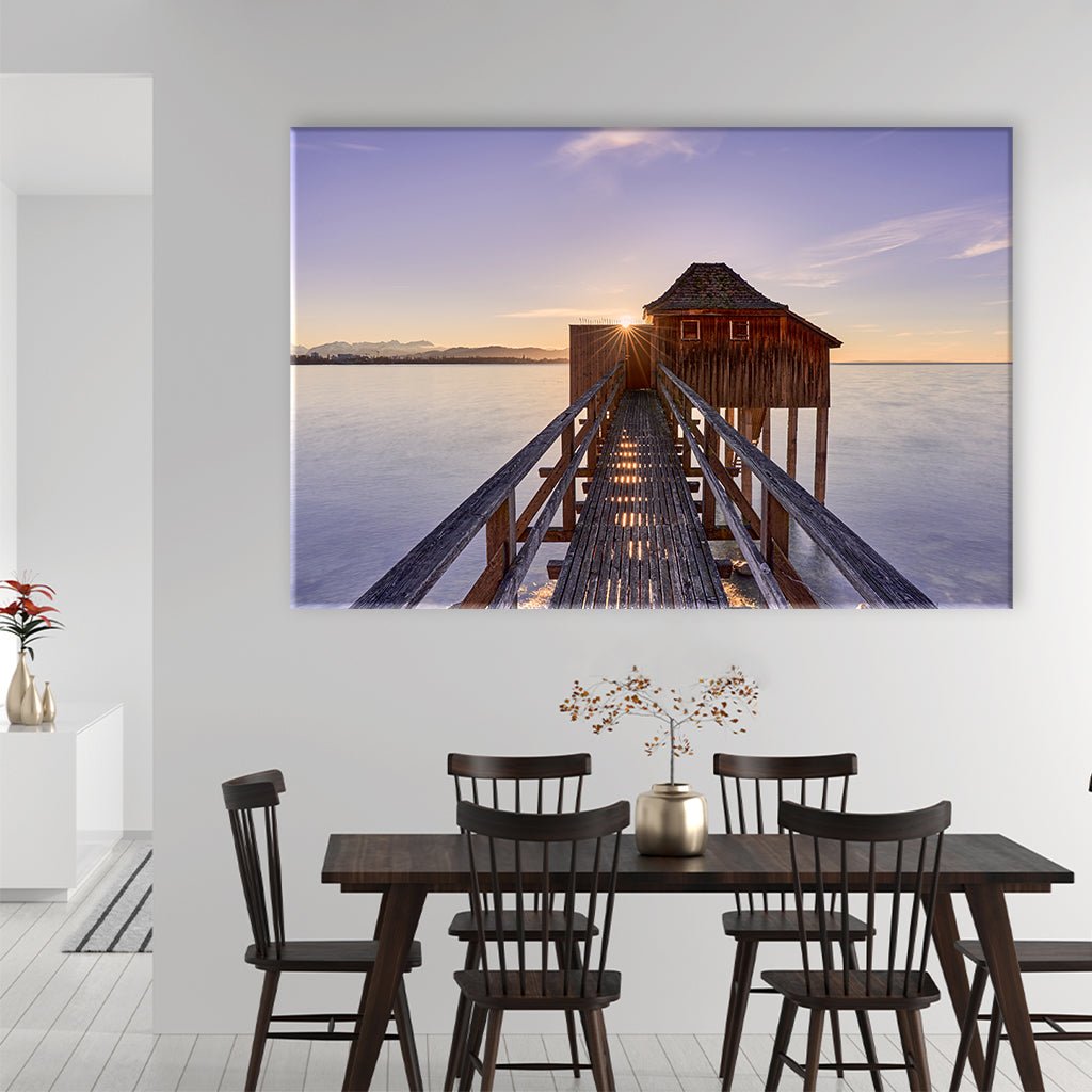 A pier that protrudes a bit into Lake Constance with a small wooden house that has a calming and stable effect in the sunrise and the morning mist over the lake.