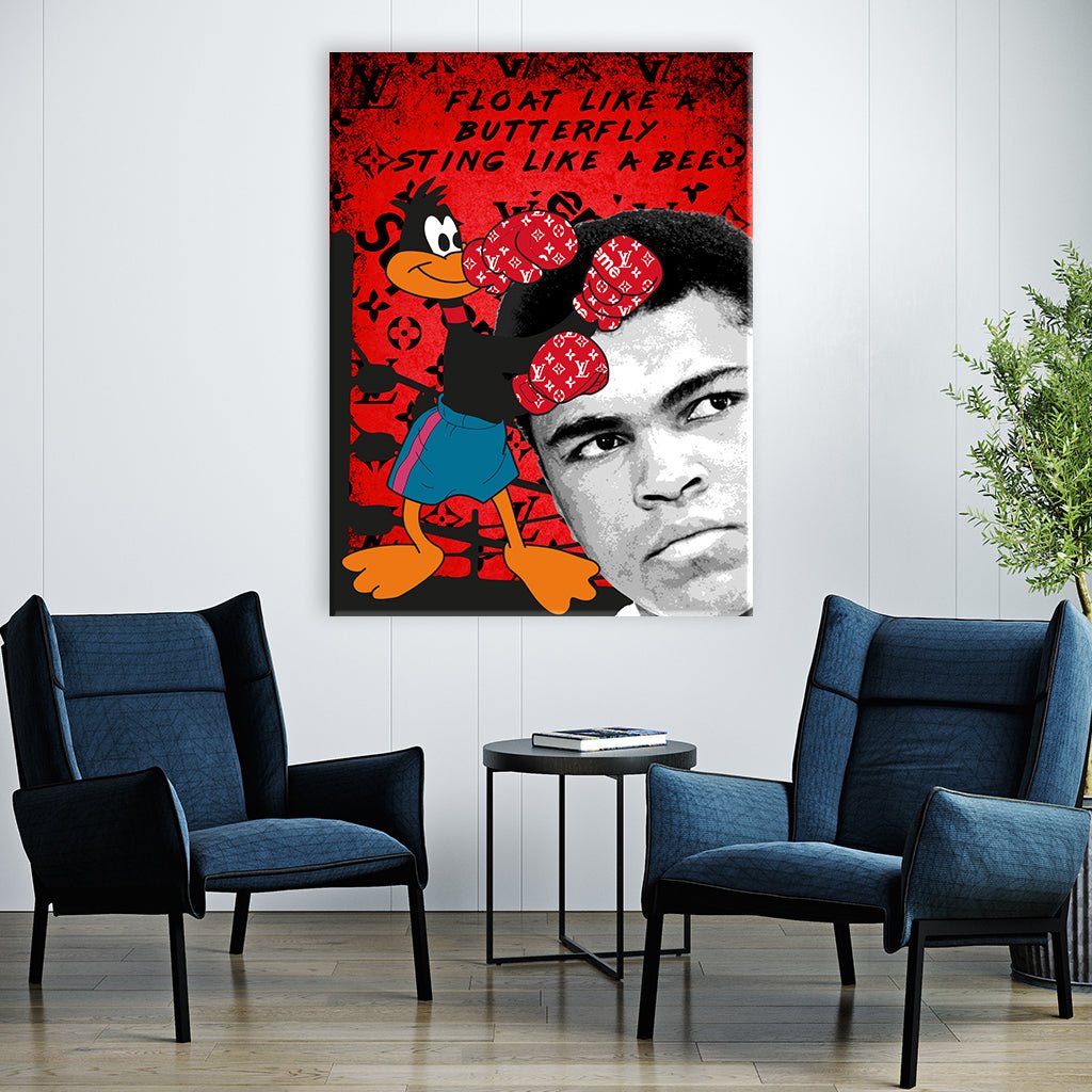 The scene features Daffy Duck in a determined and combative pose. He wears red boxing gloves with the iconic Louis Vuitton logo. The background is designed in dramatic red and black tones and includes a black and white portrait of Muhammad Ali and his most famous sentence: “Float like a butterfly, sting like a bee.”