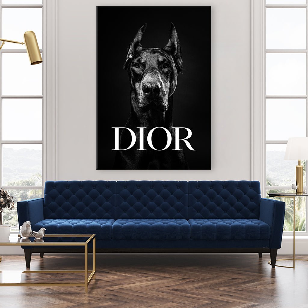 An impressive black and white photo shows a Doberman in close-up. The lettering “DIOR” is emblazoned large in the lower part of the picture. This combination of the elegant dog and the renowned brand exudes timeless sophistication and style. An image that combines the beauty of wildlife with the glamor of fashion.