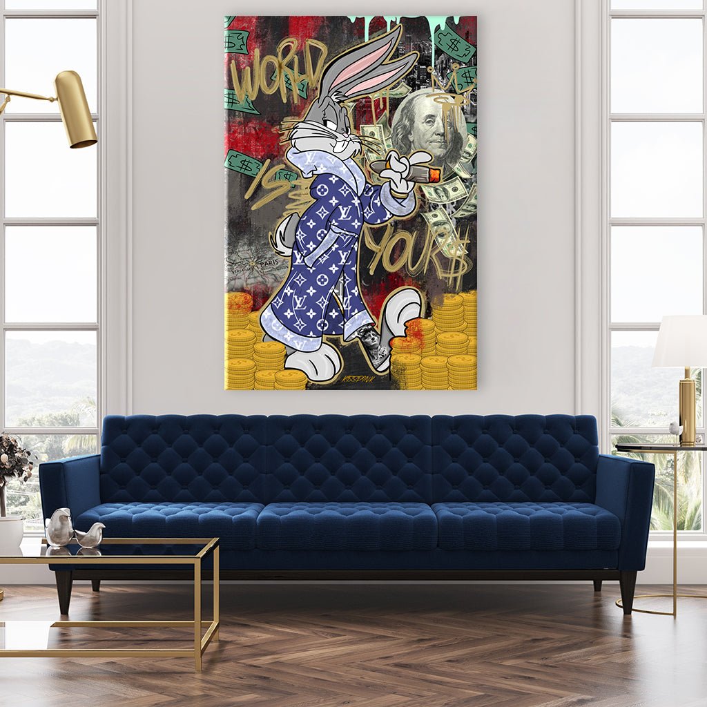 The image shows Bugs Bunny, the famous cartoon character, posing dressed in a luxurious Loius Vuitton dressing gown surrounded by cash coins. He holds a cigar in his paw, which underlines his casual and confident character. In the background, banknotes fly through the air and the text "World is yours". The image embodies an air of luxury, success and self-confidence and reminds us that we can take our destiny into our own hands.