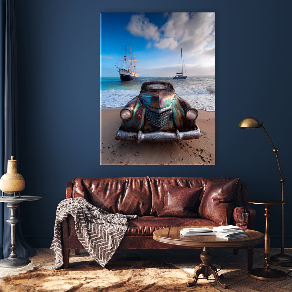 A rusty, old car sits in the sand on the shore, its headlights directed toward the viewer. In the background, the sea stretches out under a blue sky with scattered clouds. Two sailing ships can be seen on the water, one a traditional sailing ship and the other a modern sailing yacht.