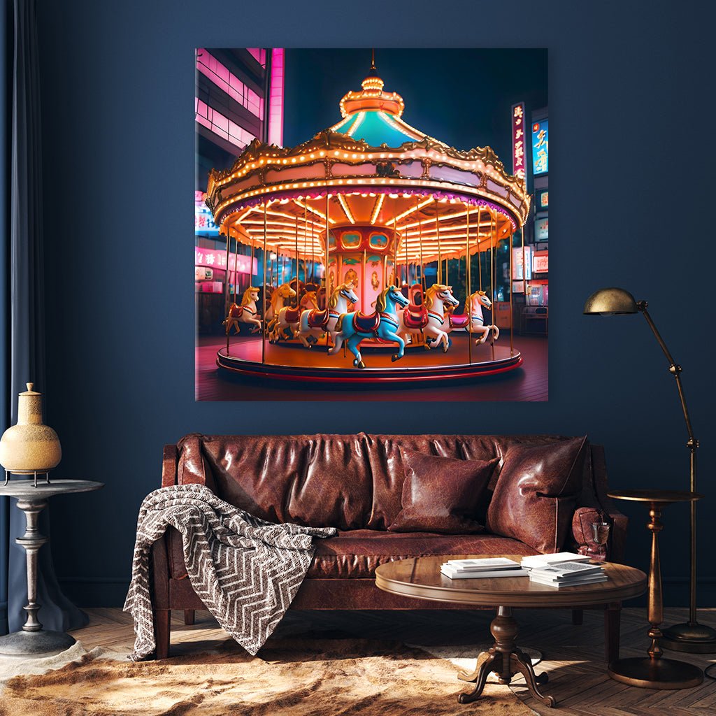 In the middle of the nighttime city center, a brightly lit carousel stands at the center of the motif. The carousel horses, lovingly designed and painted in vibrant colors, glow in the light of the numerous lamps that surround the carousel. The lights cast a warm, inviting glow on the surrounding buildings and the ground of the city center.