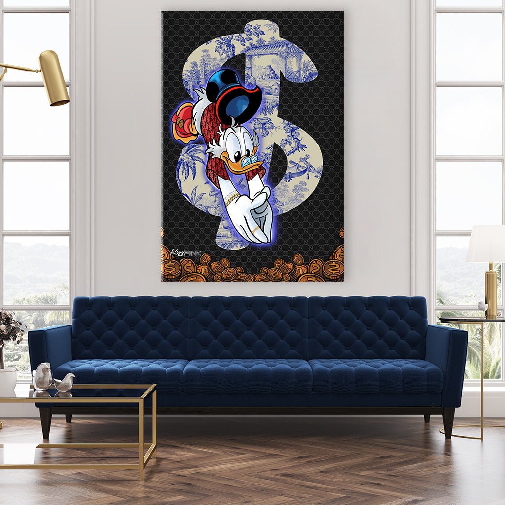 Scrooge McDuck, the most famous miser, doing his favorite activity. Jumping headfirst into his money. The black background contrasts with the scene and gives the image a certain drama. In the center of the background is a magnificently designed dollar sign depicted in Chinese painting art. The image reminds us that the desire for wealth and success can sometimes lead to unconventional actions.