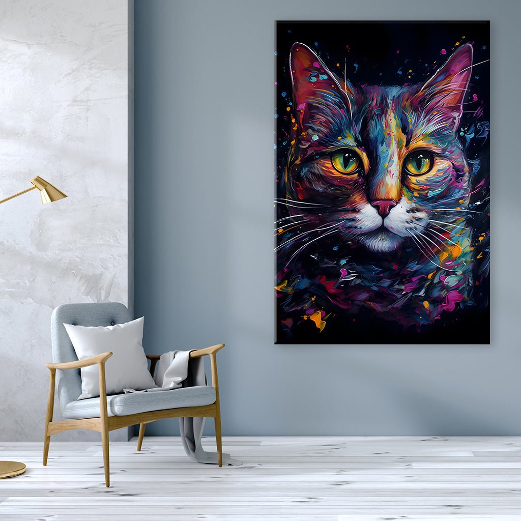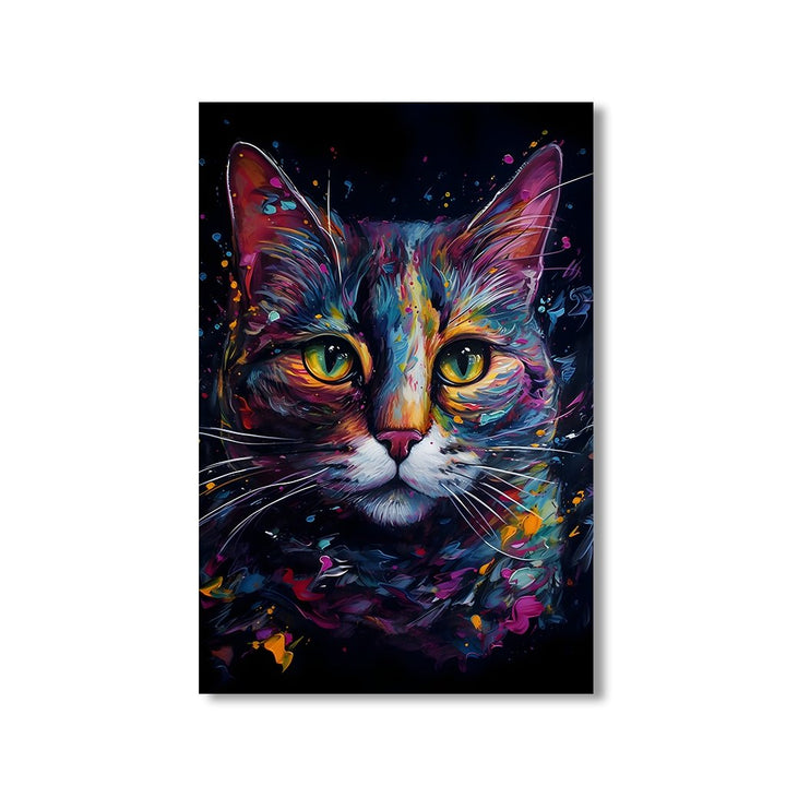 Lots of little colorful blobs of color and strokes create this cute cat, which can be seen on a black background. The many small blobs of color create a unique work of art that wonderfully combines the beauty of the lady and the creativity of the artist.