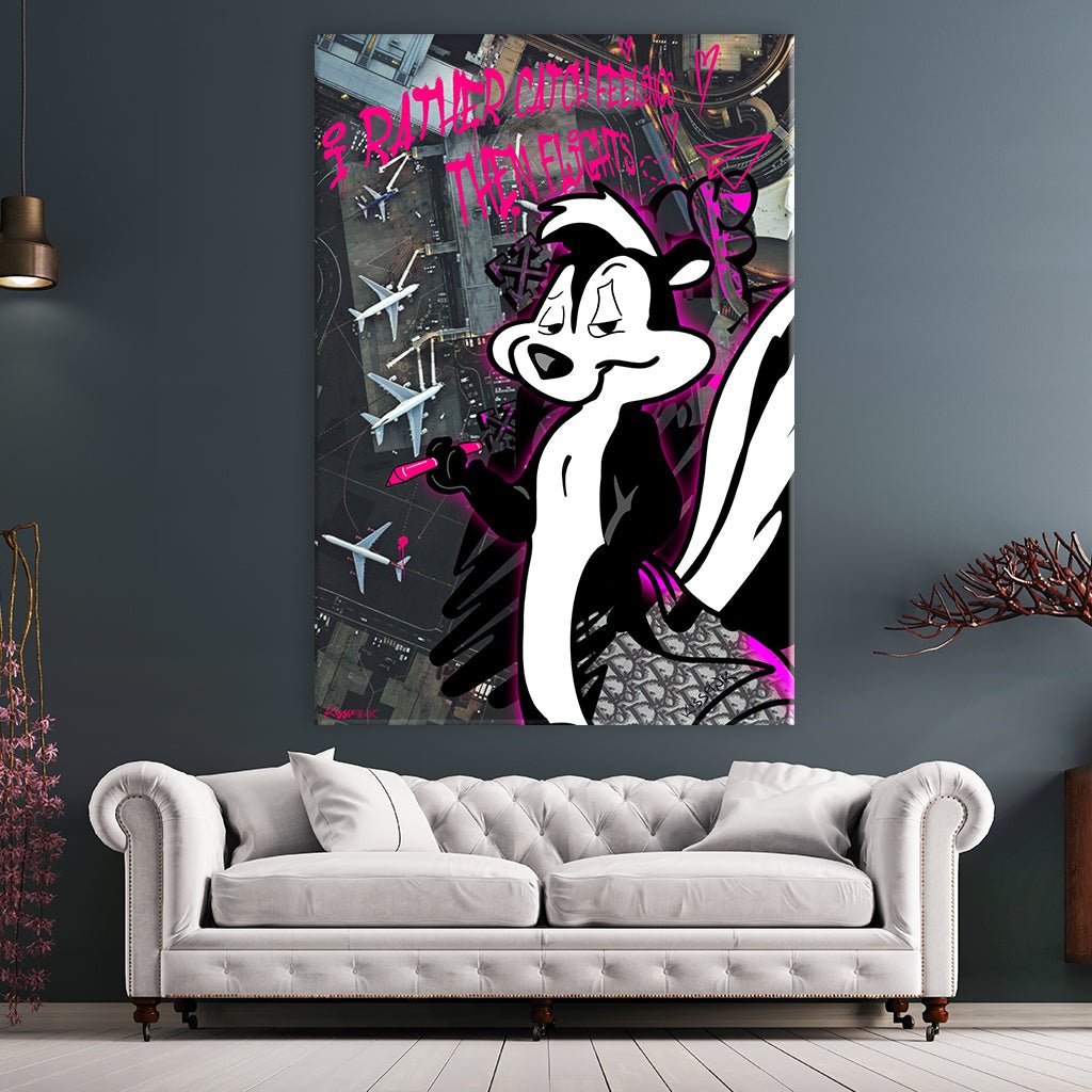 The picture shows Pepé, the charming skunk character from the Looney Tunes, with his mischievous look. In the background an airfield from above and a text in bright pink: "I rather catch feelings than flights". The phrase conveys the message of thinking about the priorities in life.