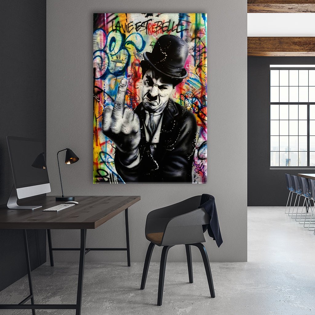 Chaplin is considered the first global movie star and is one of the most influential comedians in film history. However, in our picture he doesn't look very happy and is showing us his middle finger. In the background is a colorful graffiti wall with the phrase "Life is beautiful" written in French at the top.