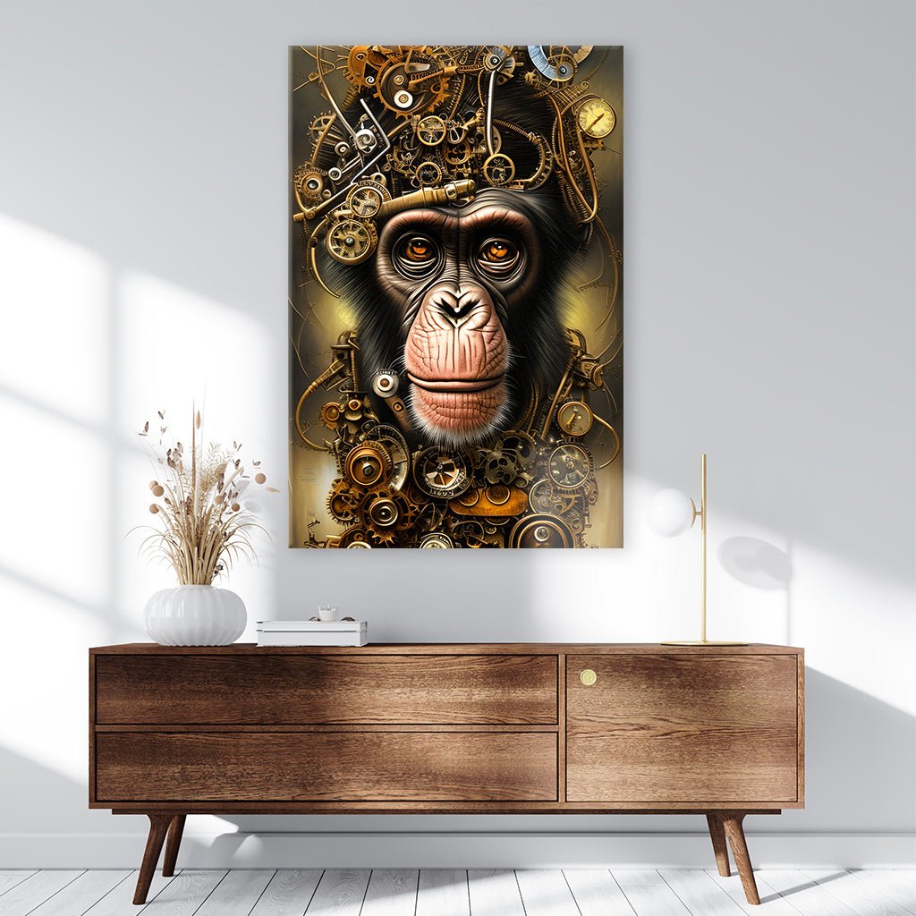 A steampunk monkey becomes a fascinating masterpiece, whose fur is crossed by a complex clockwork with gears. This artistic fusion of technology and nature creates a unique aesthetic. The steampunk style gives the monkey a mechanical elegance, while the clockwork with its gears represents a hypnotic movement.