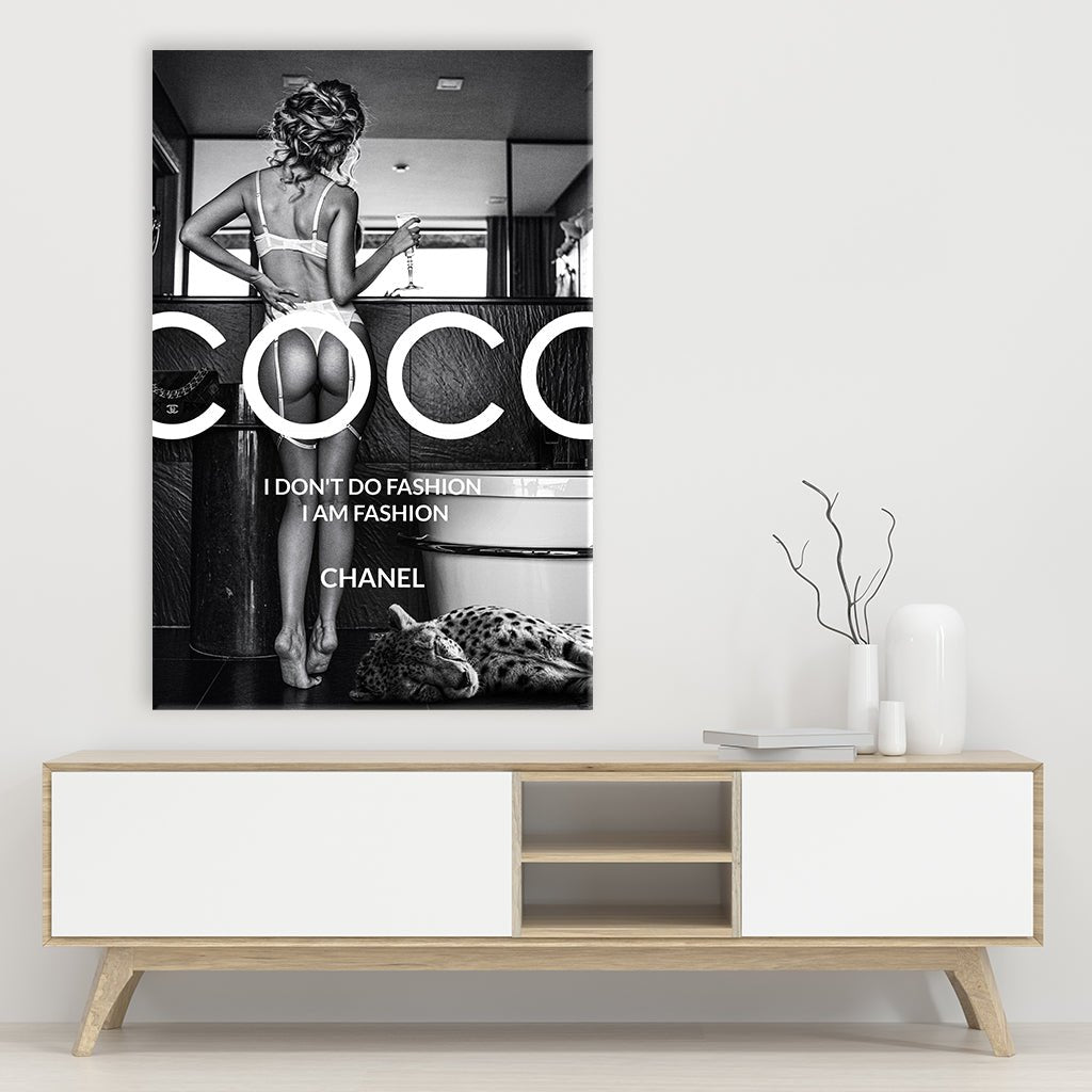 In this stunning black and white image, an elegant lady is depicted from behind as she poses in the bathroom, dressed in seductive suspenders. A sleeping leopard lies on the ground. In the lower part of the picture there is the large lettering "COCO" along with a well-known saying from Coco Chanel. This representation combines elegance, sensuality and style in a fascinating way.