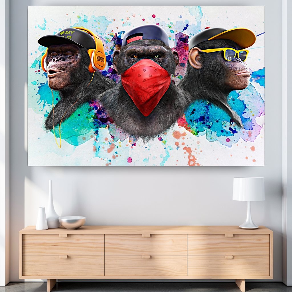 The history of the motif with the 3 monkeys originally comes from Japan and means “see nothing, hear nothing, say nothing”. On the left you will find a monkey "hear nothing" with a baseball cap and orange headphones. In the middle is the monkey "say nothing" with a red scarf and the monkey on the right "see nothing" has yellow glasses and a baseball cap on.