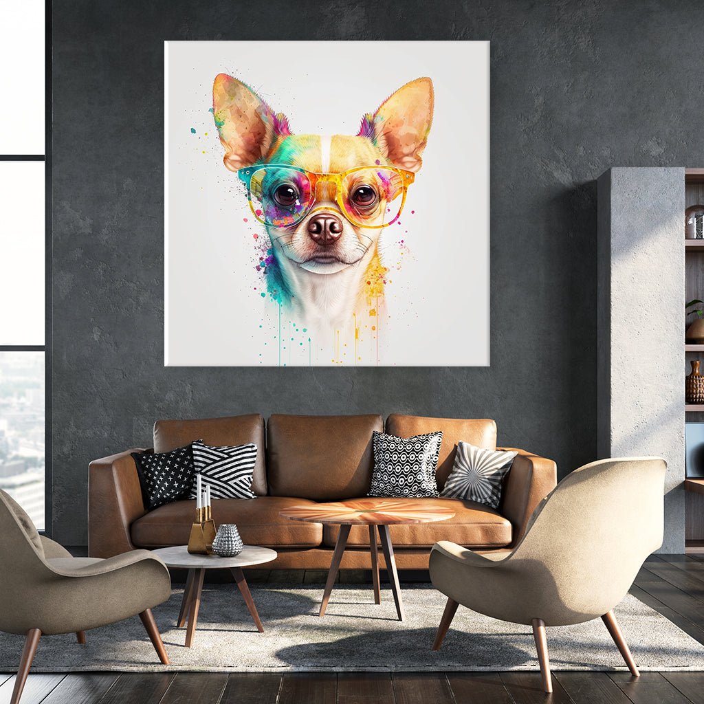 The image shows a small Chihuahua looking directly into the camera. The Chihuahua has brown fur and large, expressive eyes, which are emphasized by the glasses. The watercolor style of the image lends the motif a soft and flowing aesthetic. The colors are delicate and pastel, and the white background reinforces the impression of lightness and freshness.