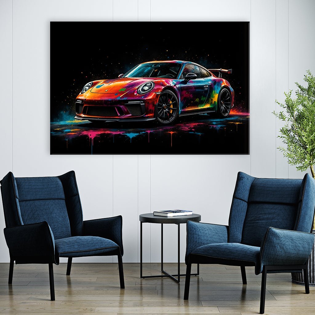 This colorful image depicts a classic Porsche 911 covered in colorful paint splashes. The paint splashes are applied in a dynamic and expressive style, creating a sense of energy and movement. The image has a dark background that allows the car to stand out.
