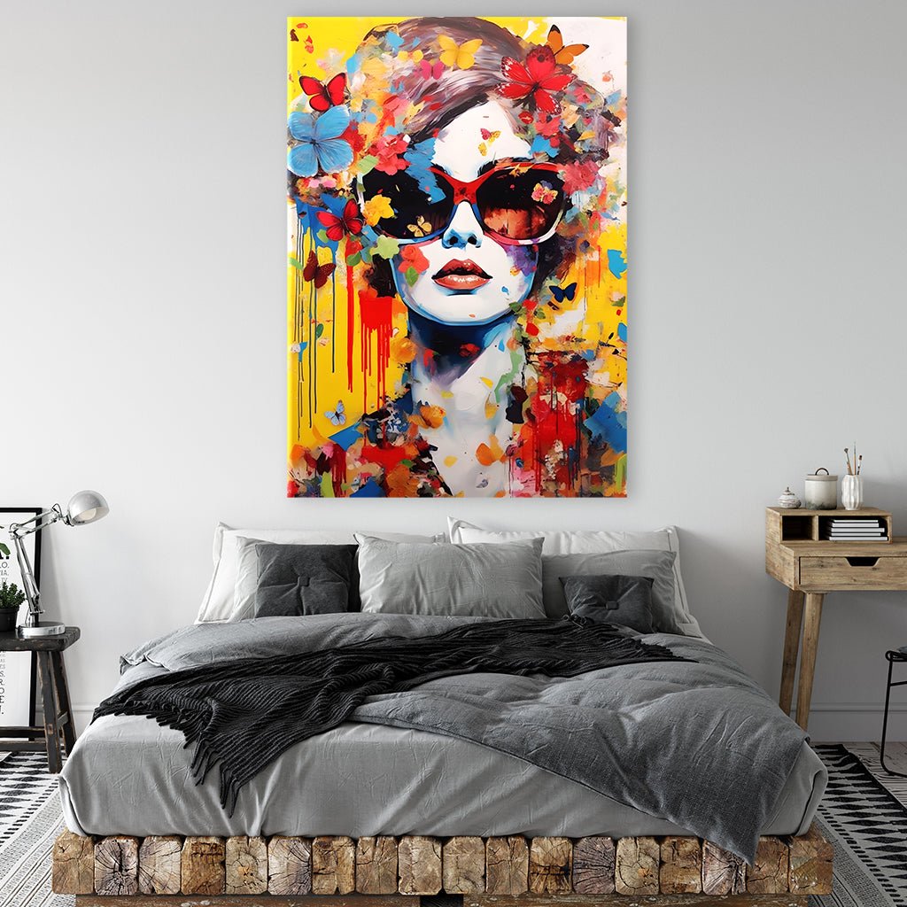A woman with large sunglasses shines in street art style. Colorful flowers and playful butterflies frame them as artistic elements. The street art aesthetic gives the image a youthful and modern touch. Whether in the living room, bedroom or hallway, this picture becomes an inspiring eye-catcher and brings life to every room.