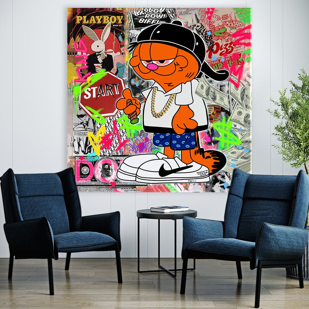 The focus of this motif is Garfield, the famous cartoon cat, in a modern and urban outfit: a white shirt jacket, blue patterned shorts, white Nike sneakers and a thick gold chain around his neck. He wears a black baseball cap turned backwards and has a casual, confident expression on his face, which is further emphasized by the thumbs up.