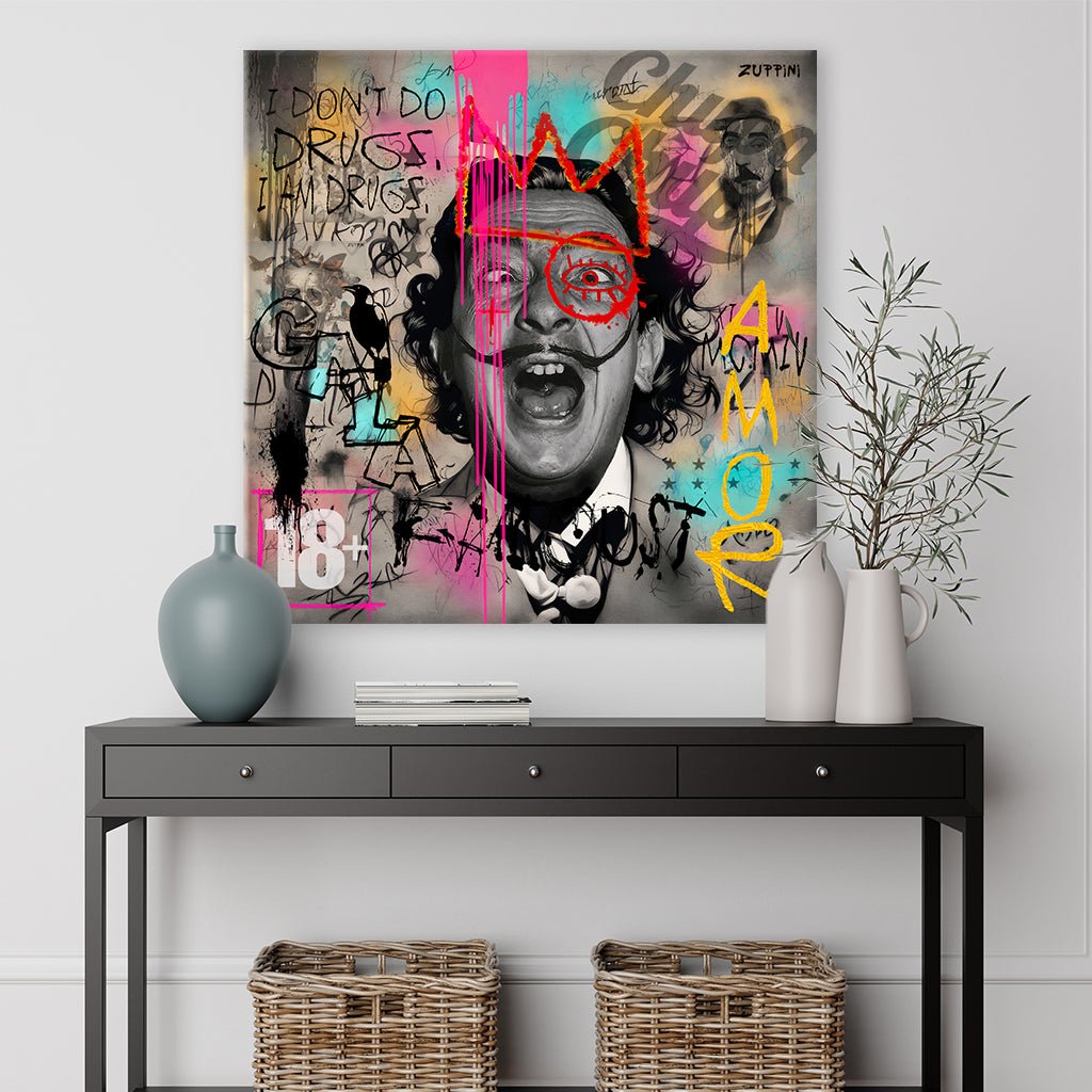 The image features a dramatically superimposed, black-and-white portrait of Salvador Dali with a wide-open mouth and a red, stylized eye. He wears a bright red and pink crown. The portrait is surrounded by chaotic graffiti elements, including "I DON'T DO DRUGS, I AM DRUGS," butterflies, and abstract paint trails.