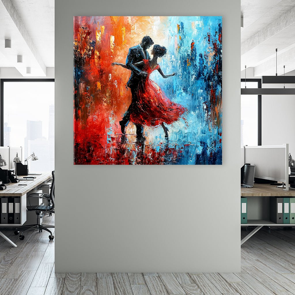 The image shows a passionate tango dancing couple, captured in the dynamic style of an acrylic painting. The shades of red and blue dominate the scene and flow harmoniously into each other from left to right, creating a captivating color gradient that underlines the movement and emotion of the dance.