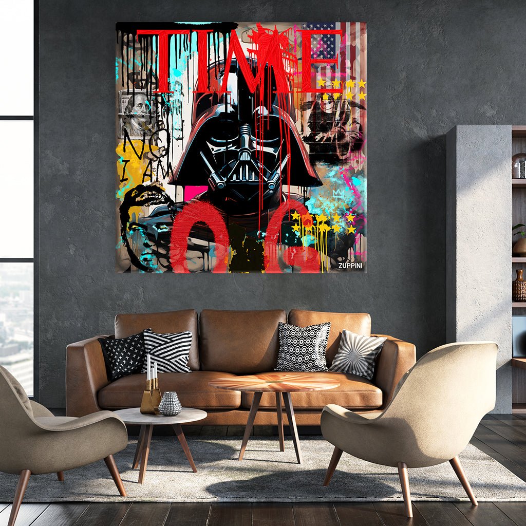 Darth Vader is centrally positioned in the image, surrounded by a vibrant mix of graffiti and collage elements. Striking features include the large red "TIME" logo at the top, the dripping paint, and other lettering and symbols such as a US flag and yellow stars.