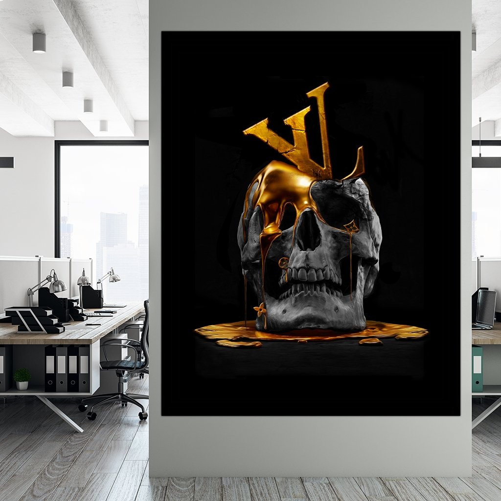 This modern motif shows a skull on a black background with the initial logo of the luxury brand Louis Vuitton. A golden liquid runs out of the skull.