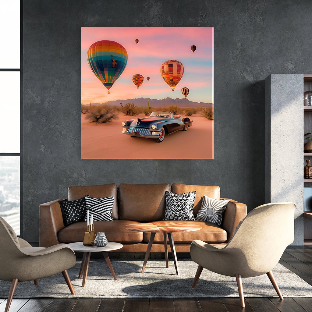 A black vintage car stands alone in the vastness of the desert. Surrounded by dry bushes, the classic car exudes a charming contrast to the barren surroundings. In the background, majestic mountain landscapes rise up, giving the scene depth and perspective. Several hot air balloons float gently in the sky, adding a colorful and dreamy element. The entire scene combines vintage charm with a wide, open desert landscape and a touch of adventure.