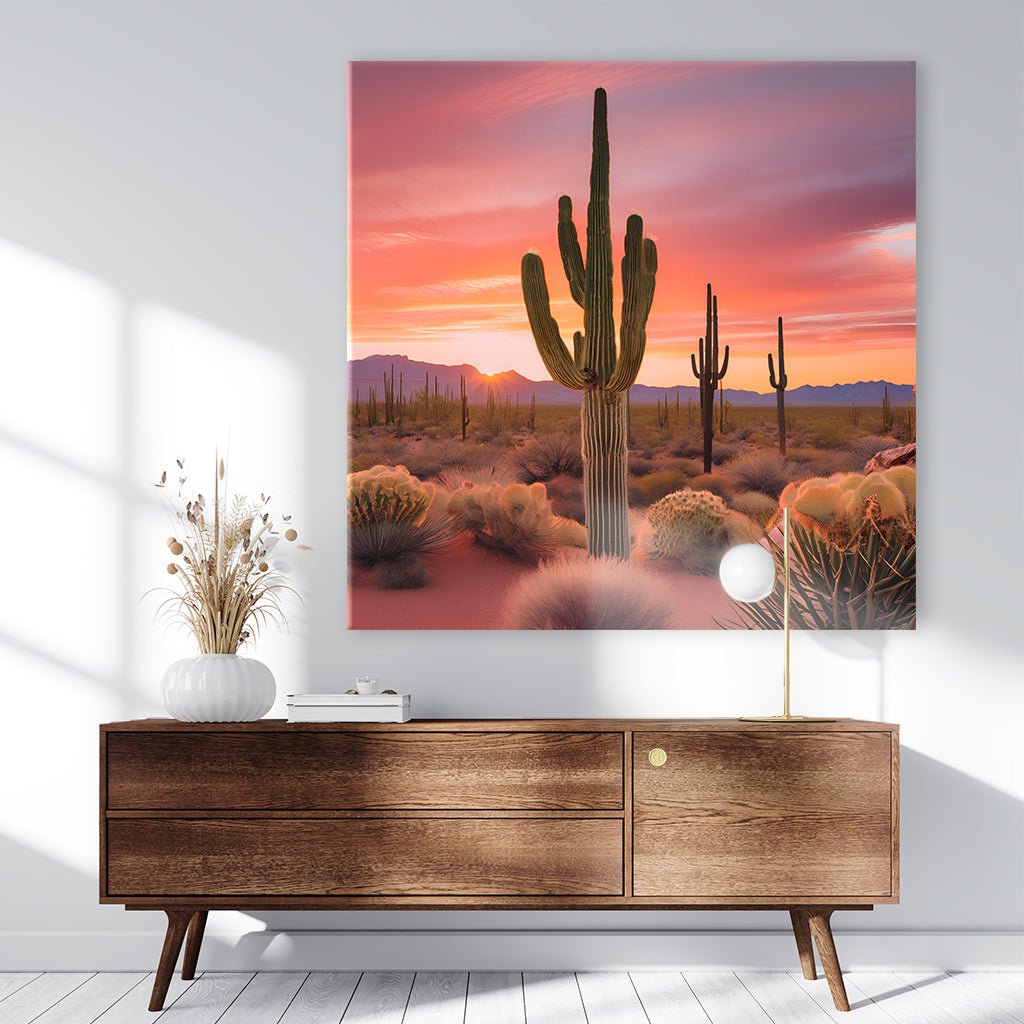 A majestic cactus takes center stage in a sprawling desert landscape, aglow in the warm light of sunset. The sky glows in intense shades of orange and pink, while the last rays of sunlight gently illuminate the surrounding plants and distant mountains. The scene is serene and timeless, with a striking depiction of the desert's pristine nature that conveys a peaceful, almost magical atmosphere.