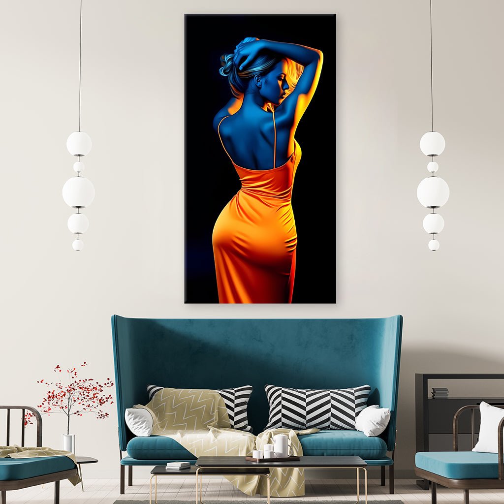 The image shows a woman from behind, wearing a tight-fitting orange dress. Her back is turned to the viewer, and she has her arms crossed behind her head. The woman is lit blue from behind, while a warm orange light falls on her from the front. The background is dark and blurred.