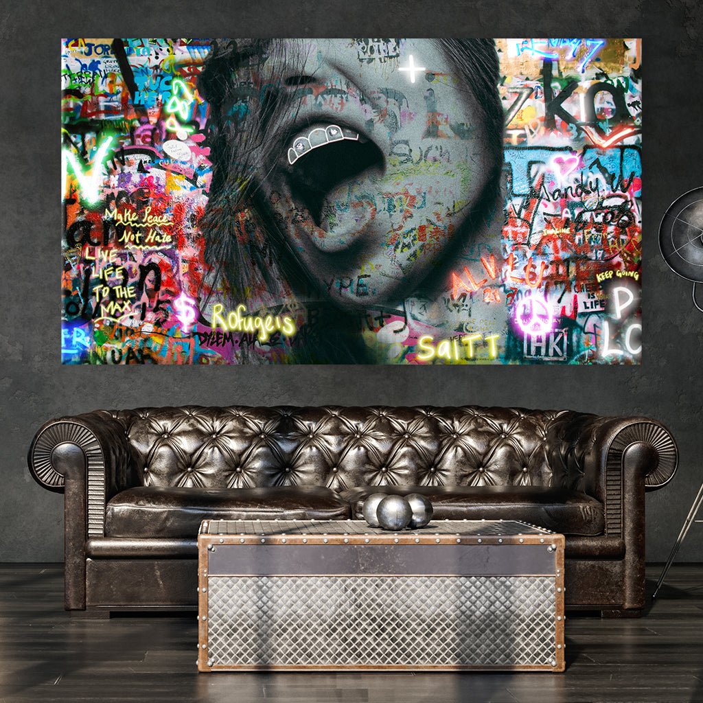 A motif that says a lot at second glance. It shows a woman with an open mouth and diamonds on her teeth on a graffiti wall. Words such as "refugees" can be seen on it, giving a lot of scope for forming an opinion on the motif.