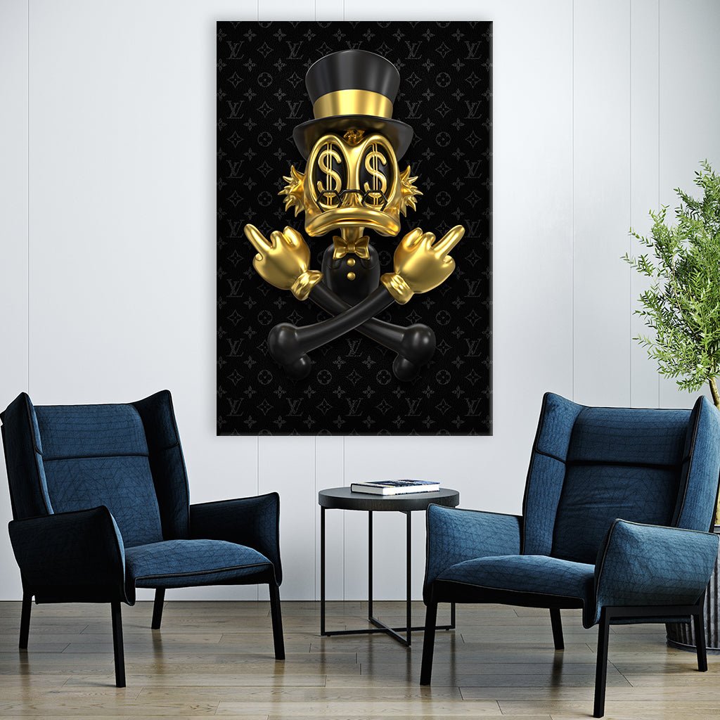 The image shows the famous duck Scrooge McDuck in black and gold. He wears gold gloves and a gold bow tie, and his eyes are replaced by gold dollar signs. The figure's hands show a provocative gesture with raised middle fingers. The background is black and features the repeating Louis Vuitton logo. Overall, the image conveys a satirical and luxury-oriented aesthetic.
