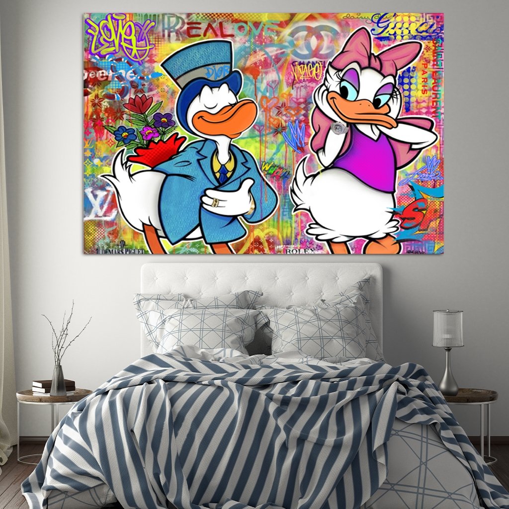 The couple from Duckburg who couldn't be more different. But their love for each other is still great. The motif could show the moment in which Donald wants to propose to his Daisy. The colorful street art style and the modern details of the branded jewelry make this picture something special and extraordinary.