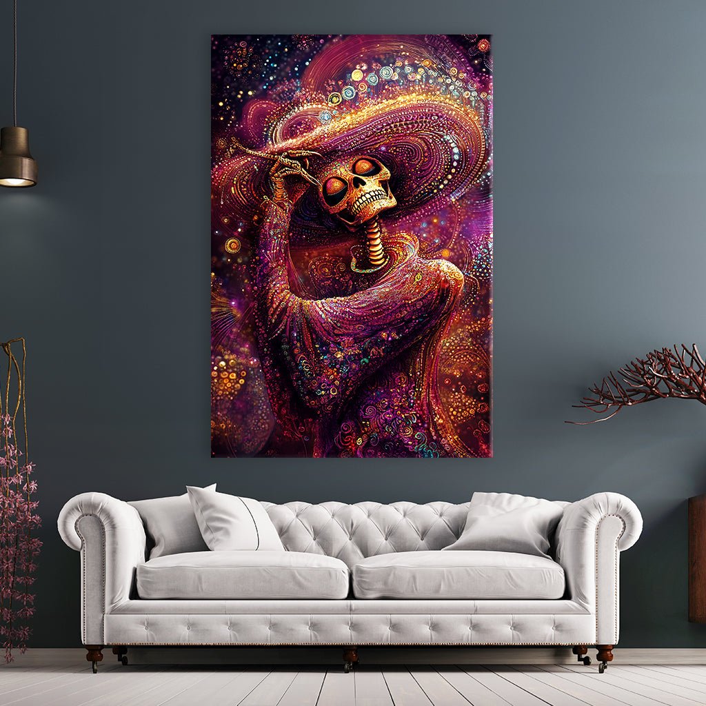 This colorful and surreal image features a skeleton dressed in festive clothing and a wide-brimmed hat. The image is designed in a dots style and features shades of pink, purple, and orange. This image is a unique and captivating depiction of the Mexican holiday Día de Muertos (Day of the Dead).