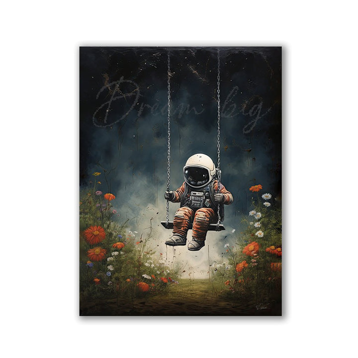 This impressive artwork shows a little astronaut sitting on a swing. The astronaut is depicted in great detail in an orange spacesuit, complete with helmet and equipment, giving the image a realistic yet dreamlike atmosphere. He is surrounded by a lush, blooming meadow with various flowers in vibrant colors lining the bottom of the image. The text "Dream big" is discreetly written at the top.