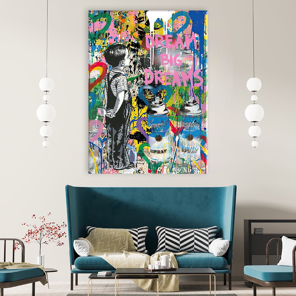 The motif shows one of Banksy's stencil techniques with the little boy holding a brush in his hand and having painted the slogan Dream Big Dreams in pink on a wall. In the background there is a graffiti wall in bright colors.