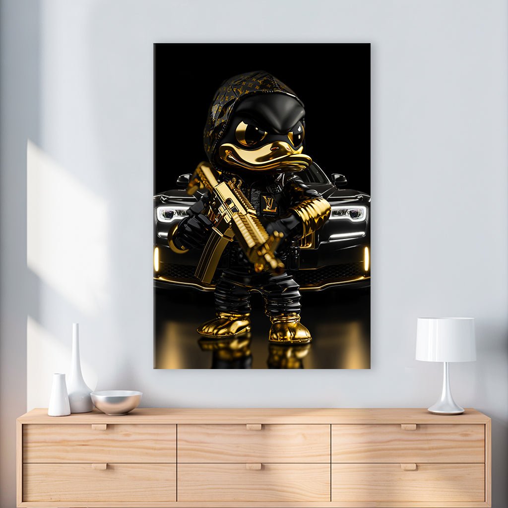 This motif features a sculpture-like duck in a black outfit holding a golden gun. It wears a bandana with Louis Vuitton logos, giving it a cool and extravagant look.