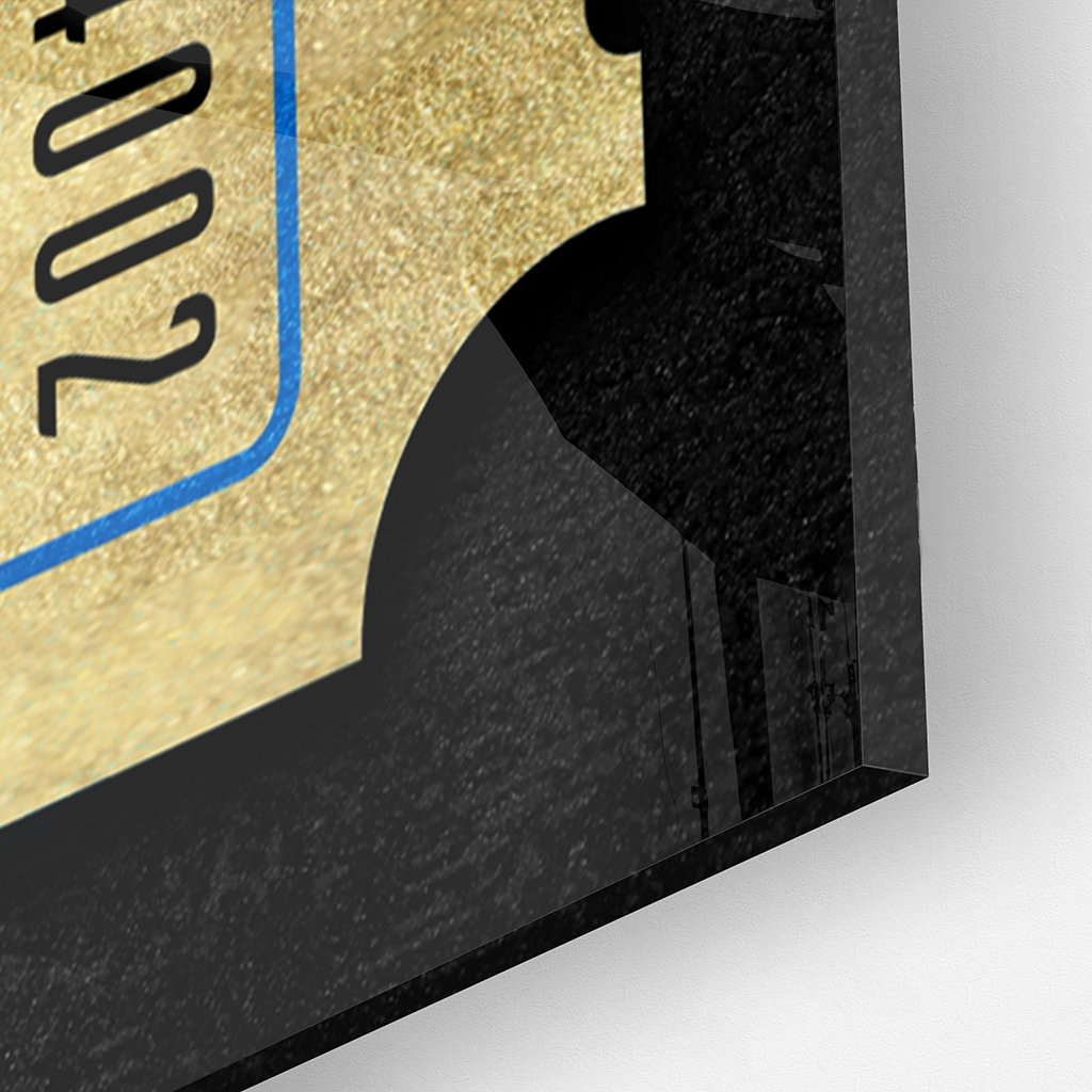 The artwork "One Life Gold on Acrylic" is an impressive and inspiring motif. It shows a golden ticket on which the inscription "One Life" can be read in blue capital letters. The black background and the blue frame on the ticket create a strong contrast and thus emphasize the importance of the message.