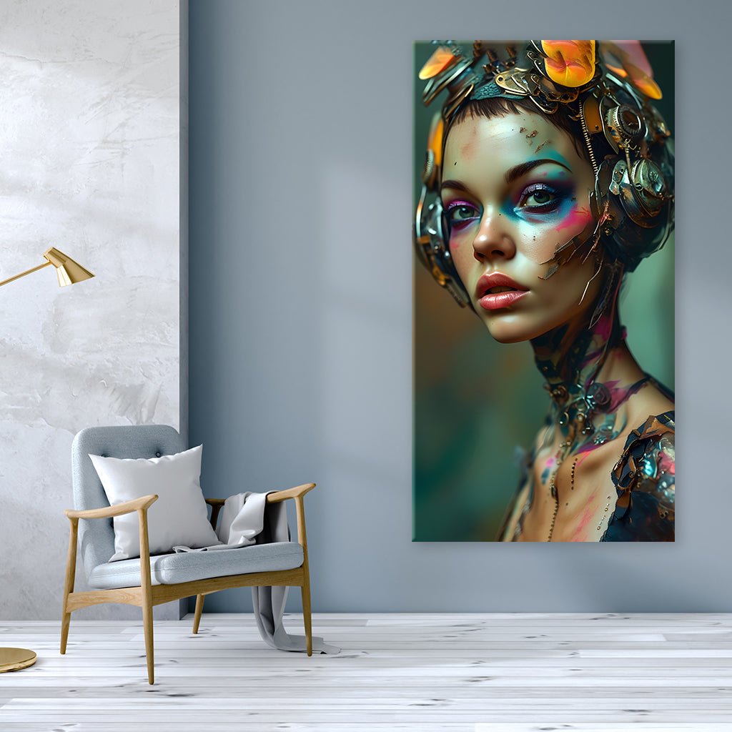 The image depicts a futuristic, cybernetic woman with an elaborate headdress composed of mechanical elements and metallic details. Her skin is painted in vibrant colors, giving her an avant-garde, almost artificial appearance. The combination of organic beauty and technological components lends the motif a cyberpunk aesthetic with artistic sophistication.